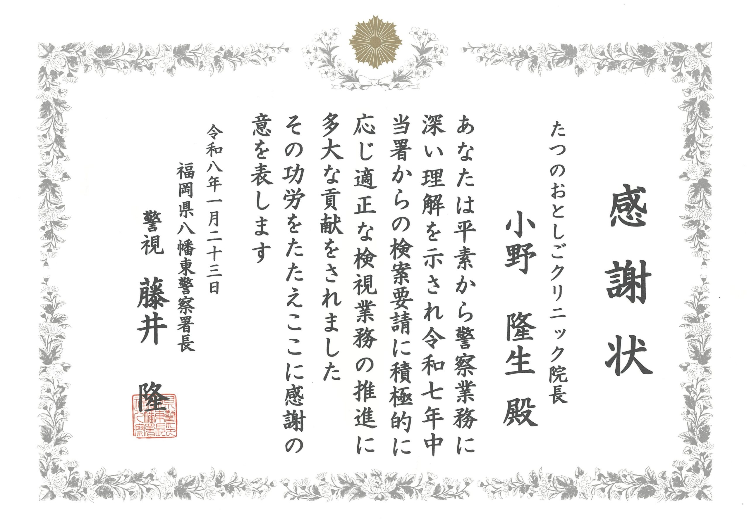八幡東警察署の藤井署長より、小野隆生院長が感謝状をいただきました。